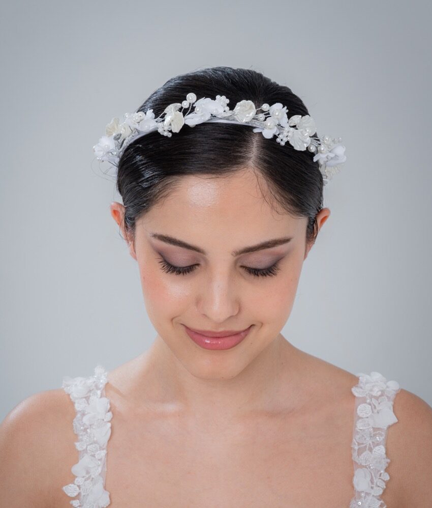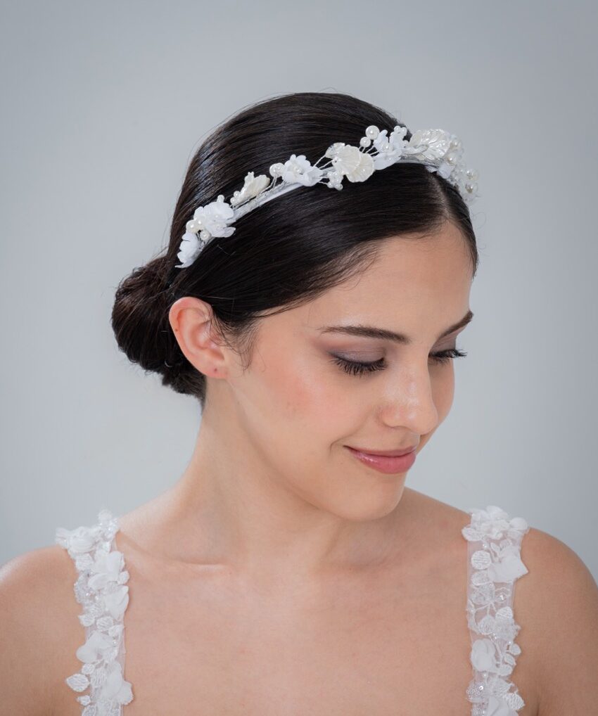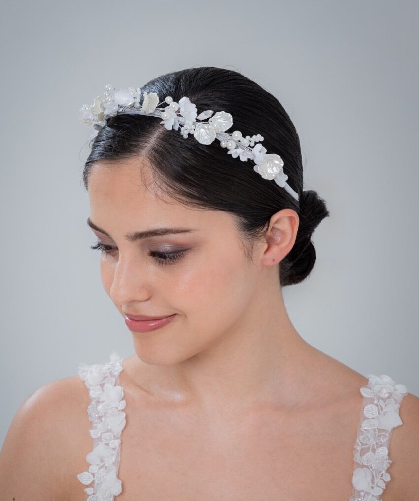 手作りのあたたかみあるカチューシャ。繊細な装飾がやさしく輝き、ナチュラルでロマンティックな印象に。アットホームな結婚式にもぴったり。