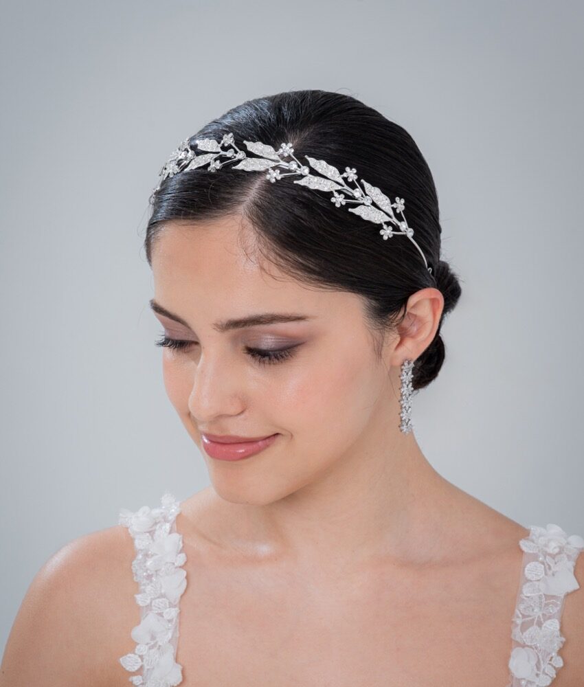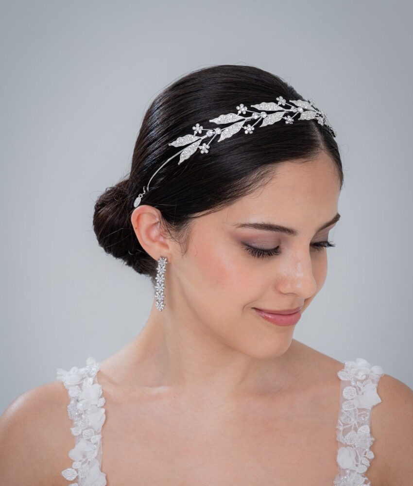 Headband adorned with delicate leaves and small flowers, featuring sparkling details that add natural charm and elegance. Perfect for a romantic garden wedding.