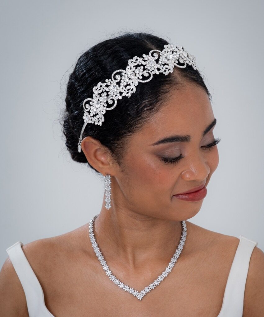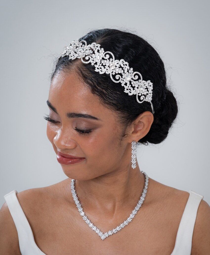 Sparkling headband that stands out without adding height like a tiara. Perfect for brides who want a dazzling look while keeping a natural silhouette.