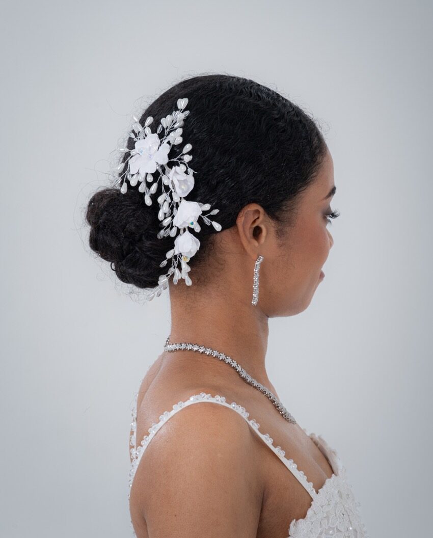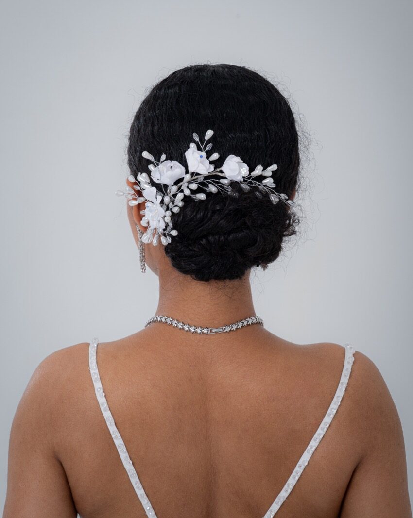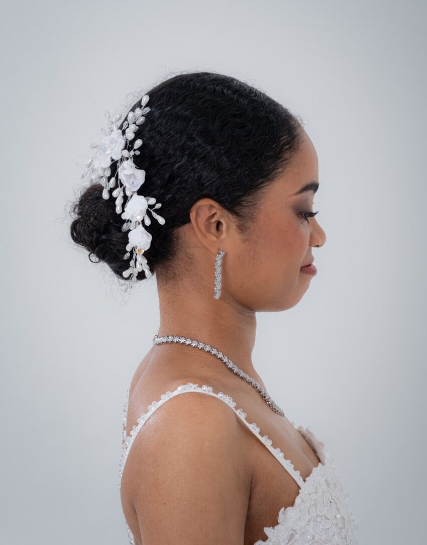 Handmade white headpiece with subtle sparkle and elegant design, evoking a soft, floral-inspired feel. Perfect for winter weddings and versatile enough to complement a variety of bridal styles.