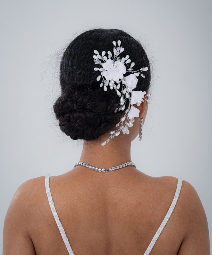 手作りの白いヘッドピース。控えめな輝きと上品なデザインで、花びらのような柔らかい印象を演出します。冬の結婚式にもぴったりで、さまざまなスタイルに合わせて使えます。