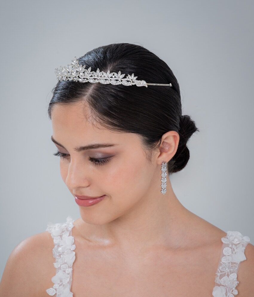 繊細で華やかなティアラ。キラキラと輝くクリスタルが可愛らしさを引き立て、ロマンティックな花嫁姿を演出します。可愛い花嫁にぴったり。