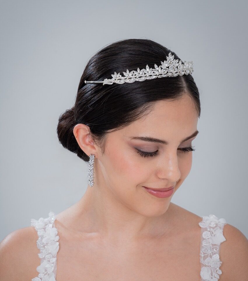 Delicate and sparkling tiara that highlights a charming, romantic look. Crystals catch the light beautifully, adding a touch of playful elegance. Perfect for brides who want a cute and enchanting style.