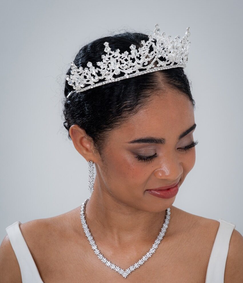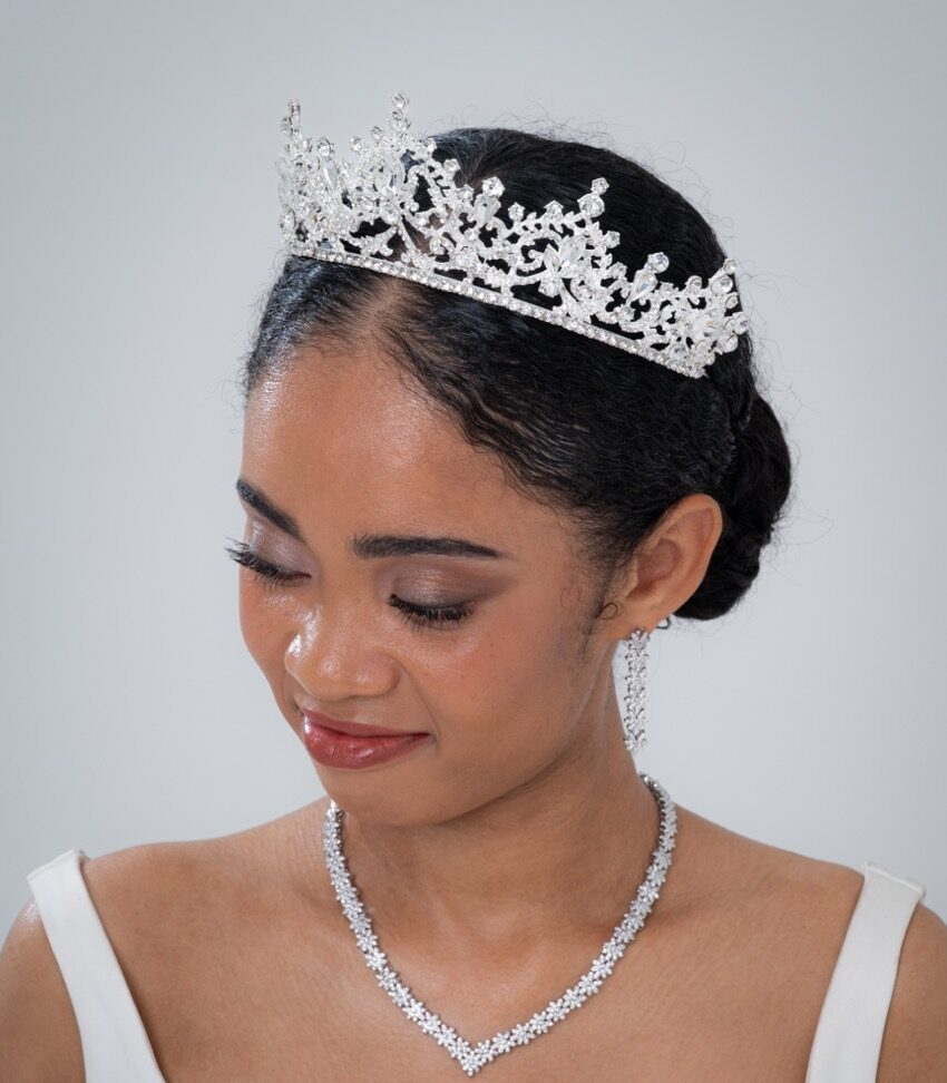 Bold and sparkling tiara, designed to complement glamorous princess line or royal style dresses, adding a luxurious touch for a truly memorable wedding day.