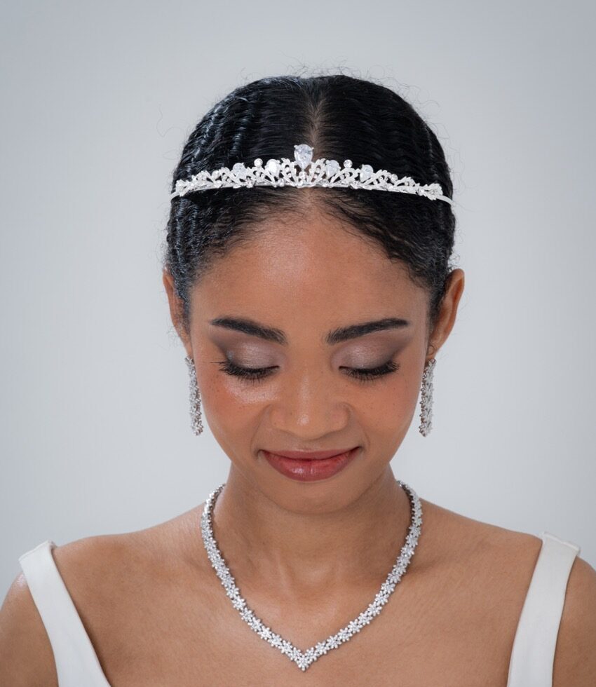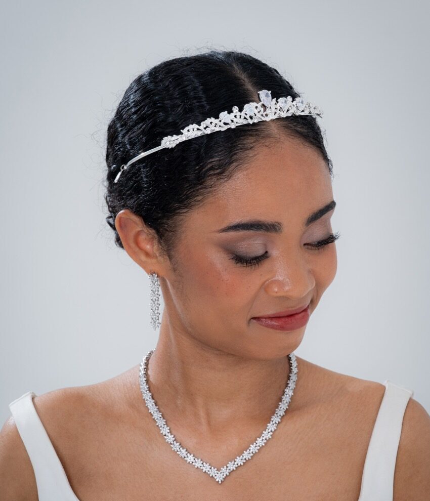 繊細で小さめなティアラ。輝くクリスタルで上品な華やかさを演出します。控えめながらも優雅さを求める花嫁にぴったりです。