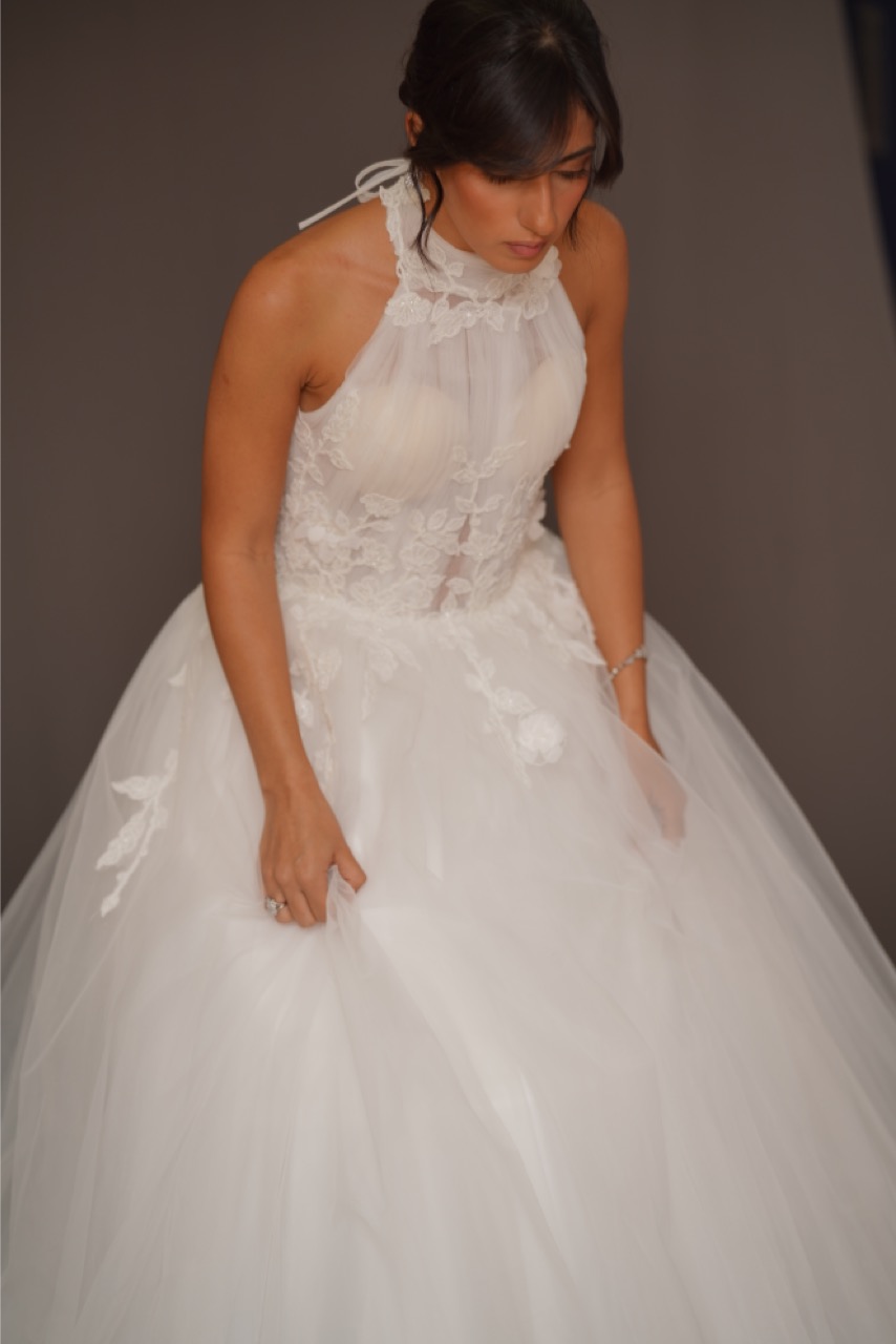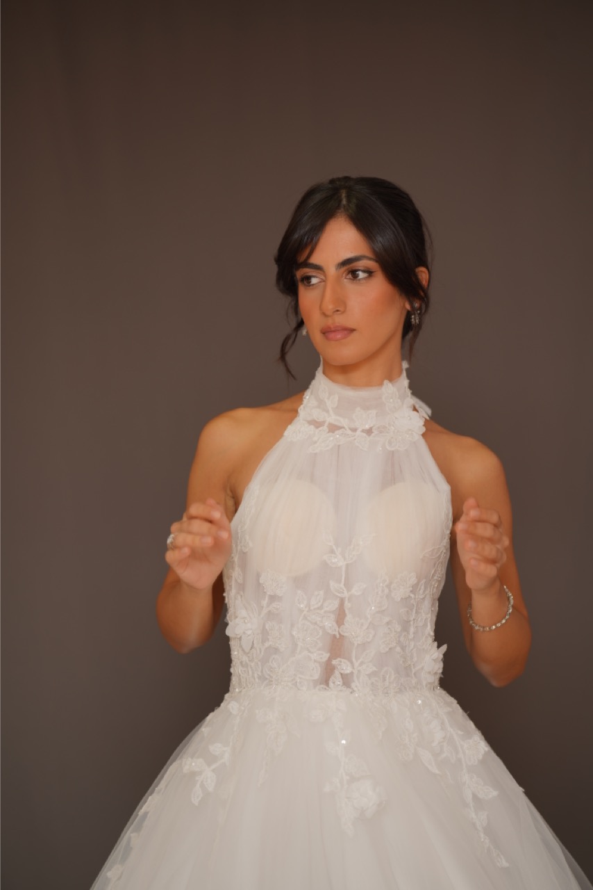A halter neckline beautifully highlights the shoulders, paired with a softly flared A‑line silhouette for a graceful bridal look.