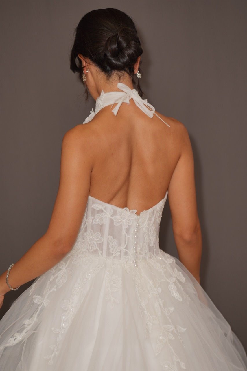 首元を美しく見せるホルターネックと、ふんわり広がるAラインが魅力のウェディングドレス。