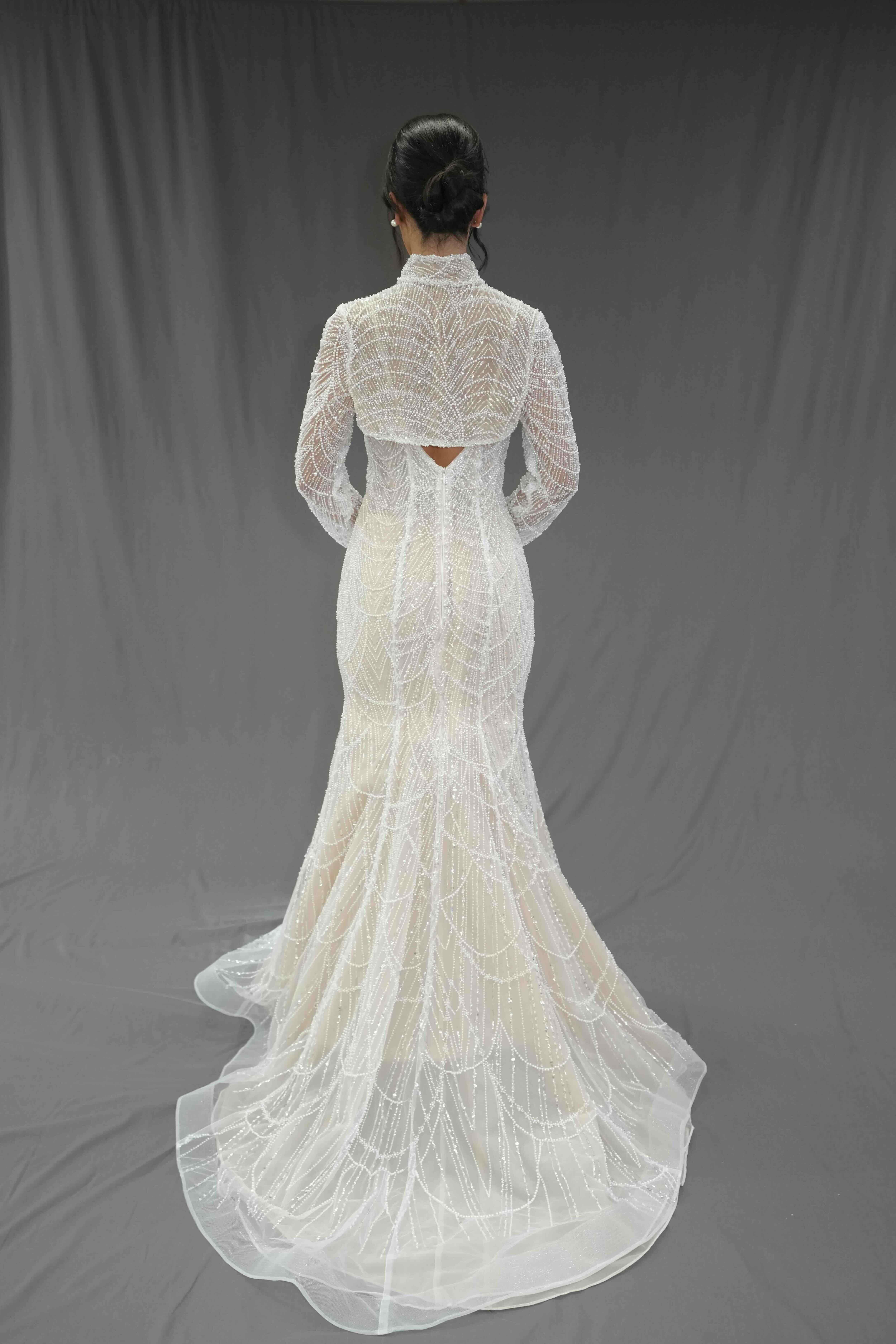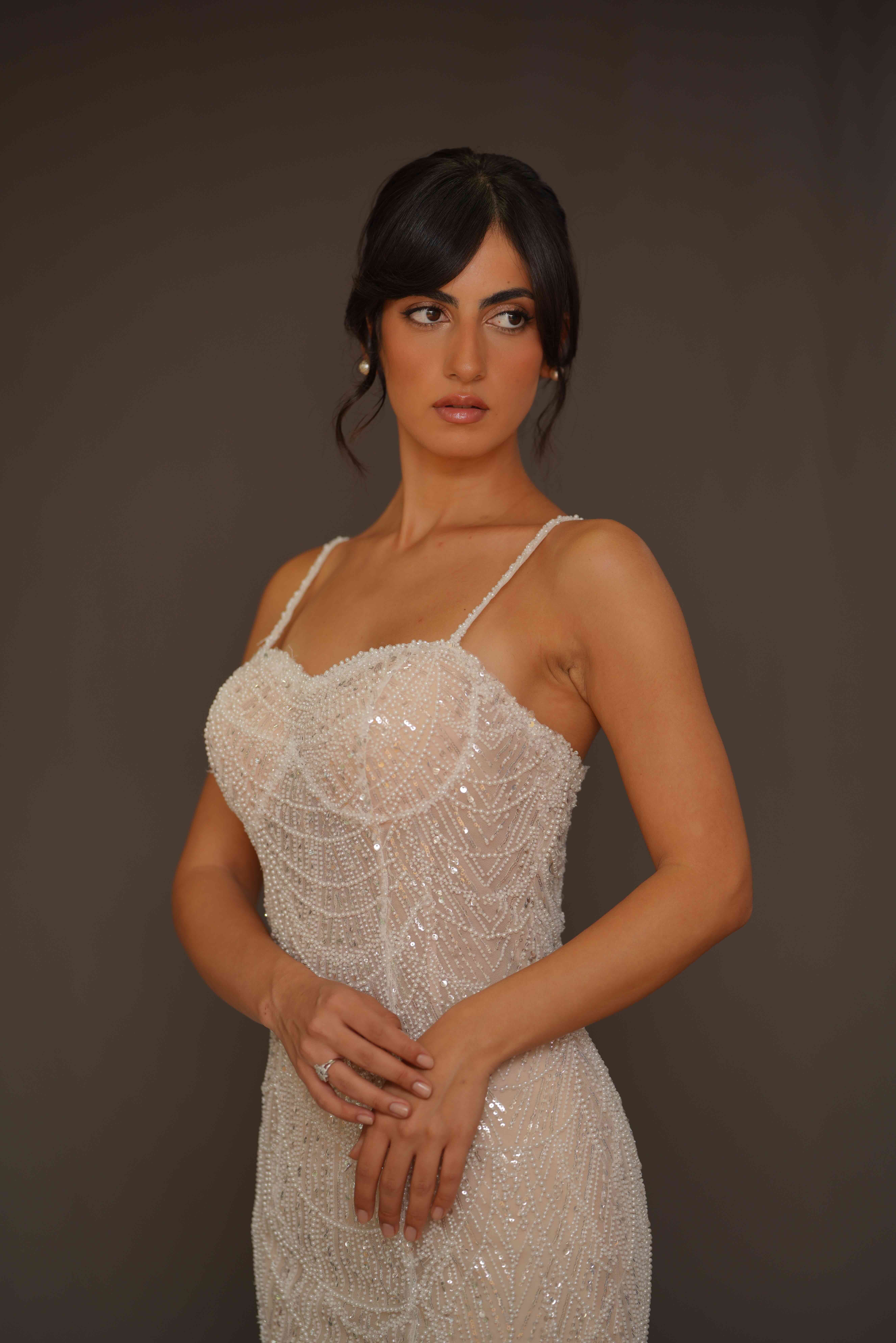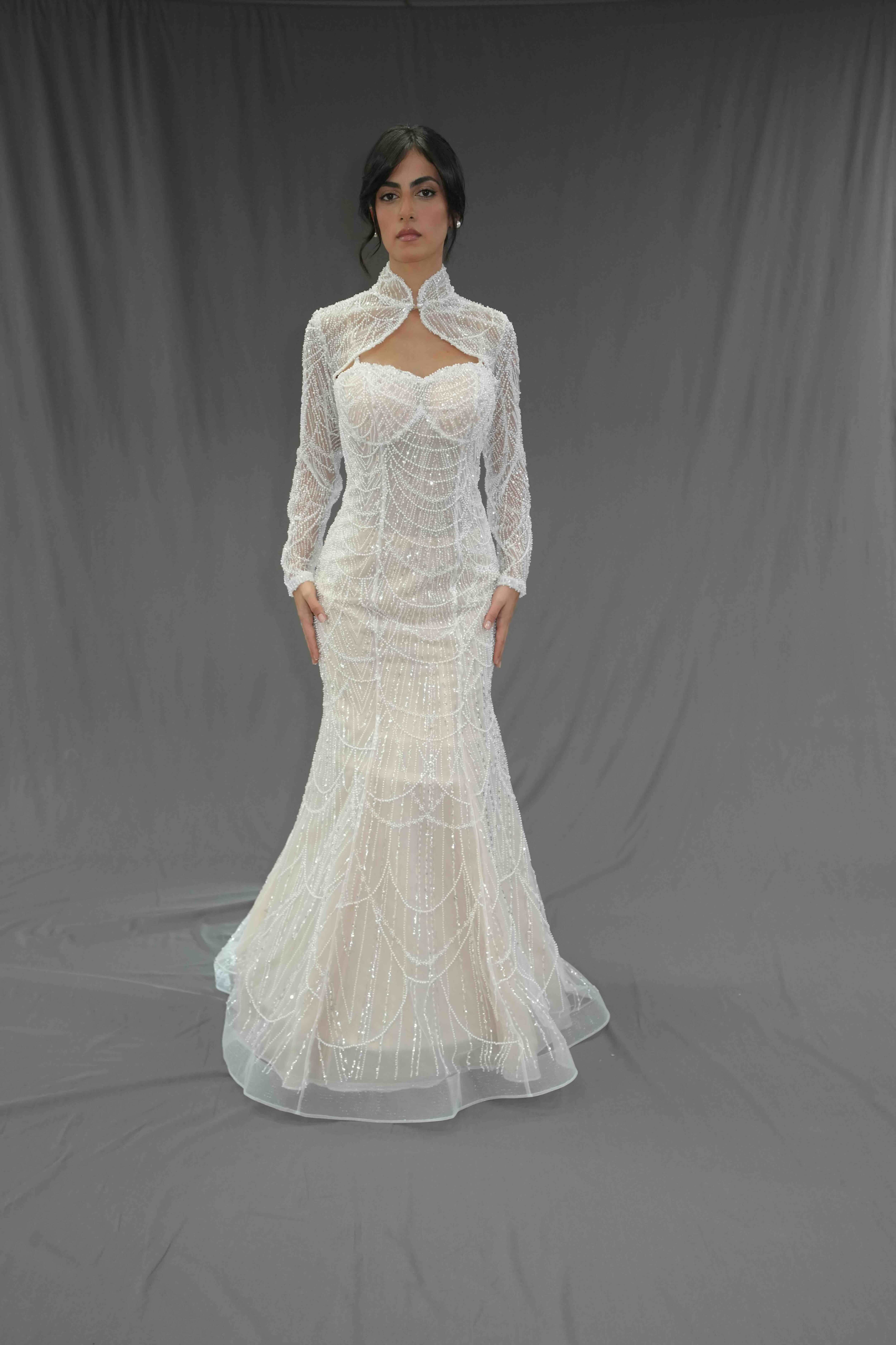 A shimmering mermaid gown adorned with sparkling embellishments that beautifully contour the silhouette.