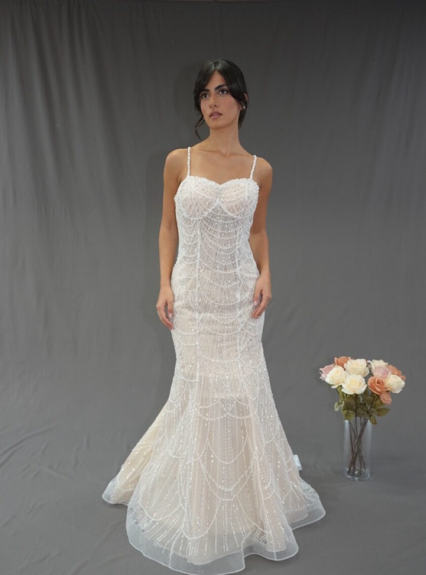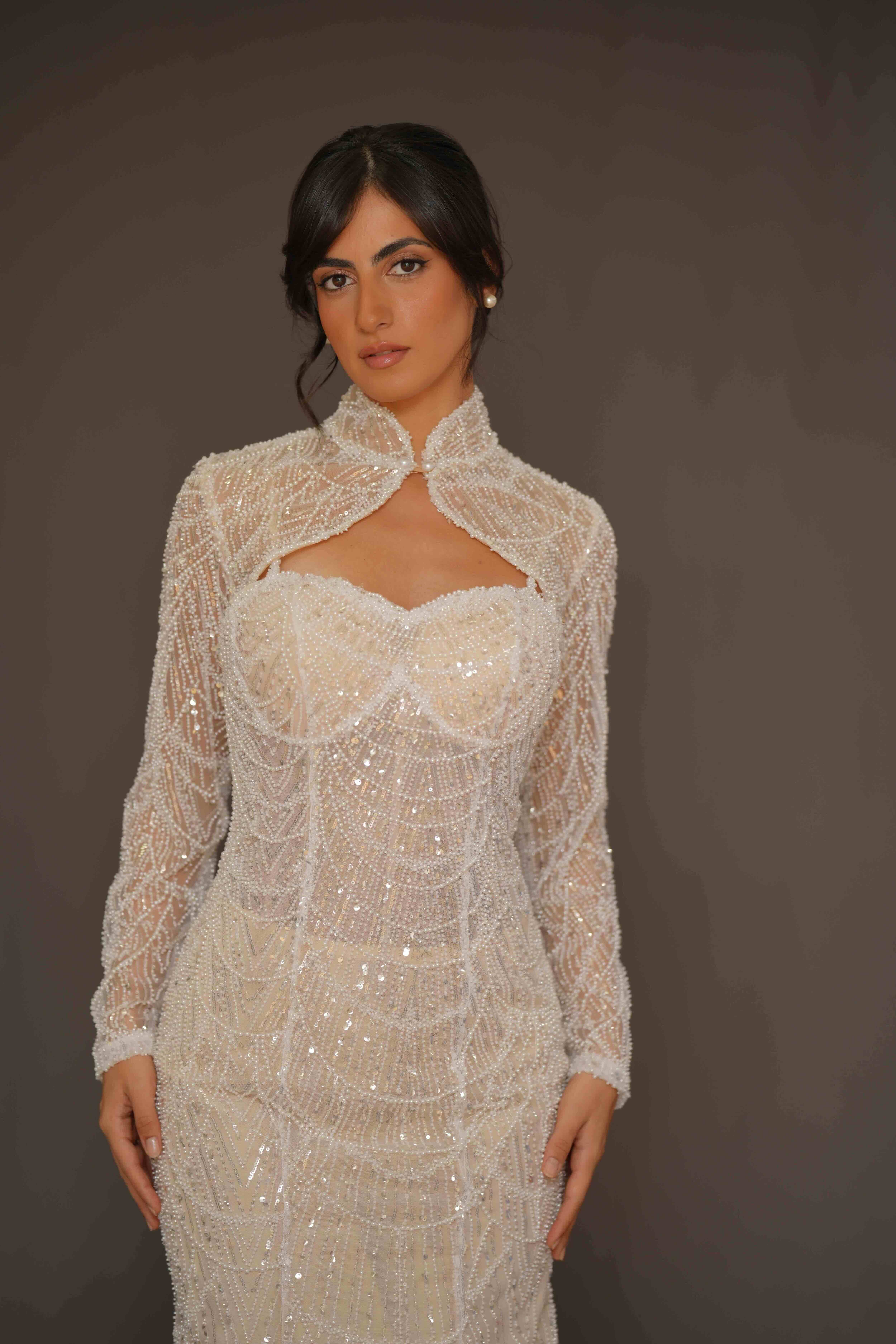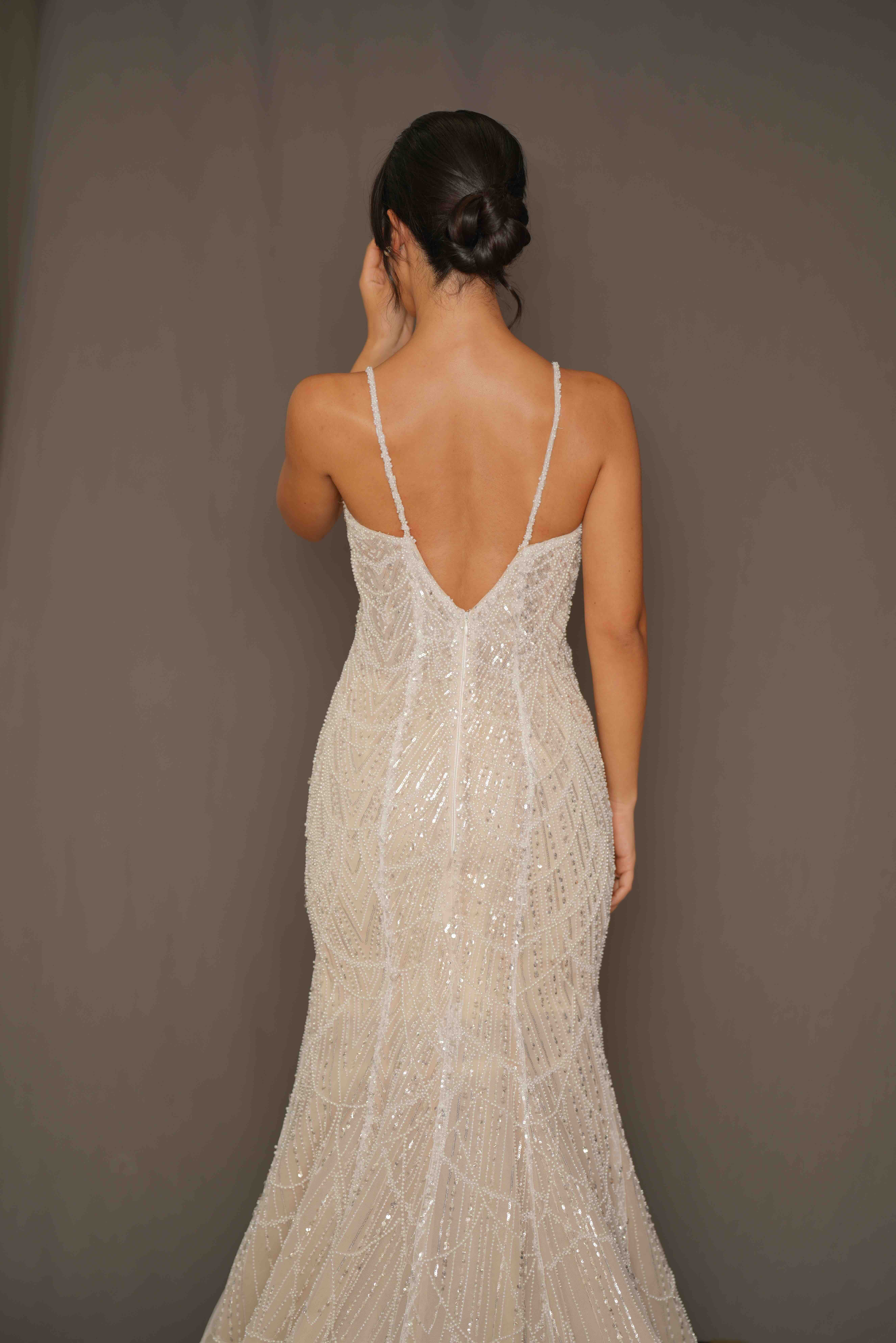 A shimmering mermaid gown adorned with sparkling embellishments that beautifully contour the silhouette.
