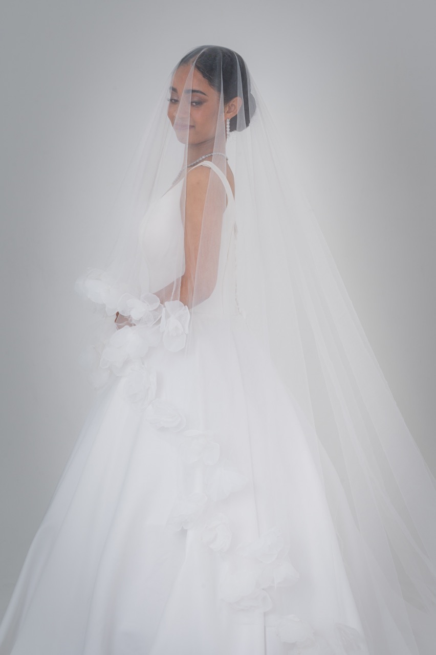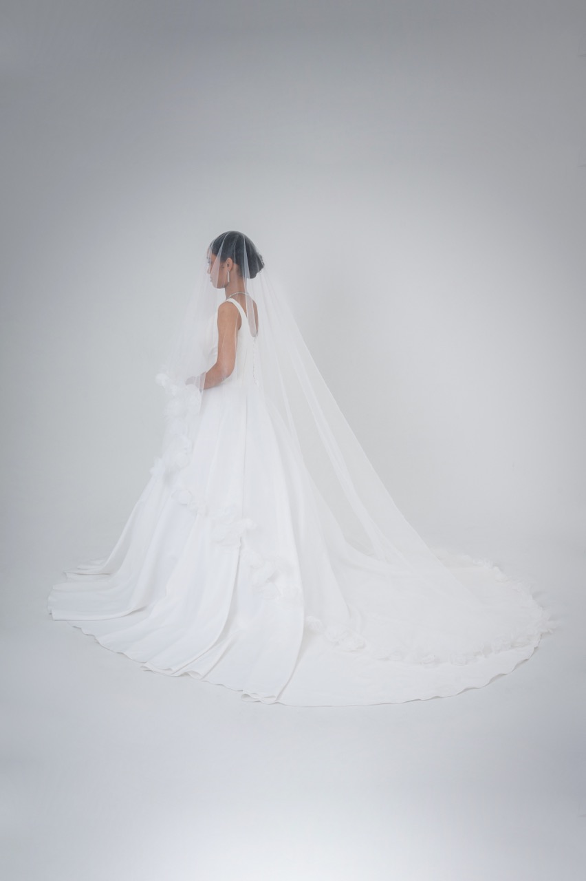 Handmade long veil with flowers along the edges. Delicate yet luxurious, it perfectly complements brides seeking an elegant and striking look.
