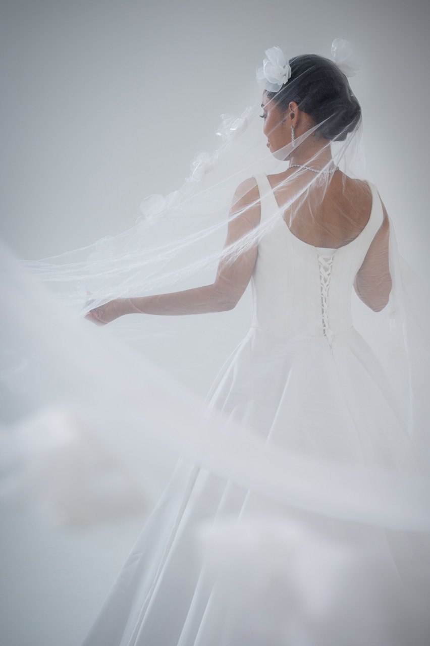 ベールの端に手作りの花があしらわれたデザインのロングベール。繊細さを残しつつ、華やかさとエレガントさを兼ね備えた花嫁にぴったりの逸品です。