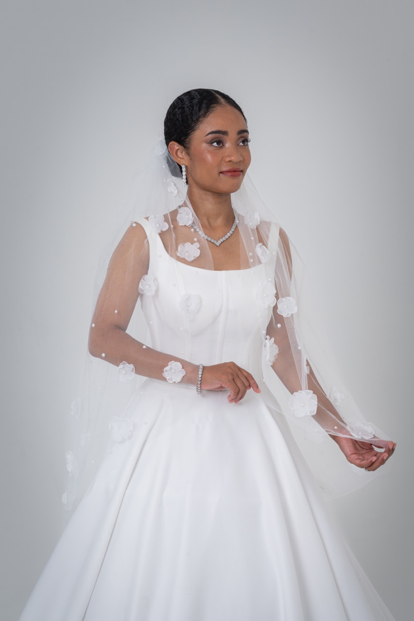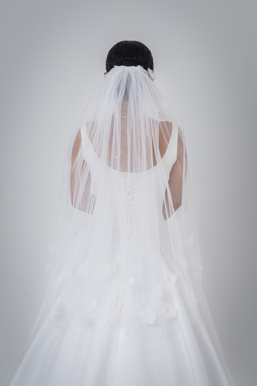 手作りの花柄を全体に散りばめた腰までのベール。ガーデンウェディングやビーチウェディングなど、自然を感じる挙式にぴったり。特に春の季節に映える、可憐で華やかな一枚です。