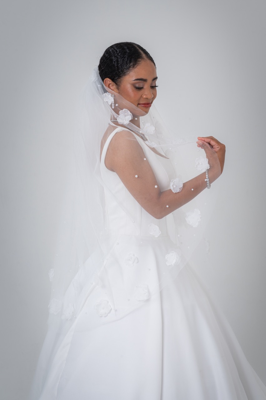 Handcrafted floral accents are scattered throughout this waist length veil. Perfect for garden or beach weddings, it captures the essence of nature and is especially stunning in spring ceremonies.
