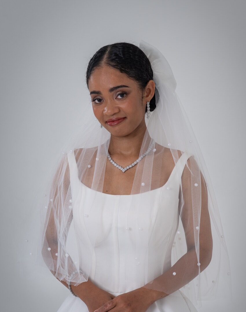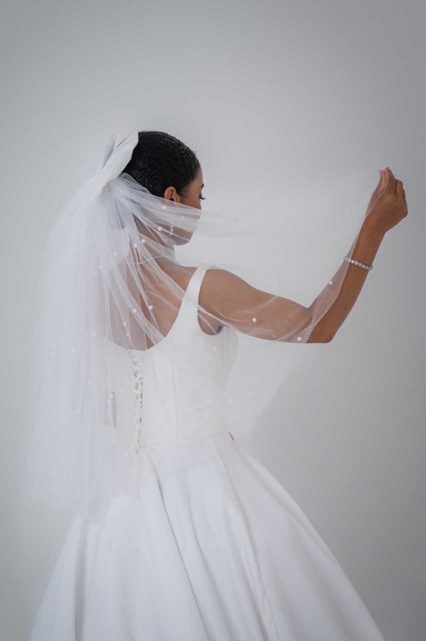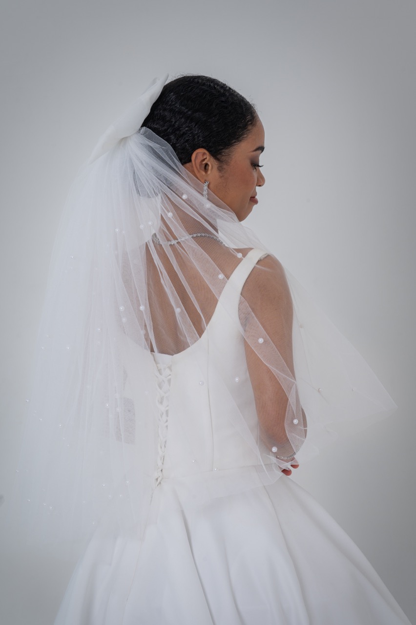 A waist length veil featuring a ribbon accent and scattered pearls. It strikes the perfect balance between sweetness and elegance, ideal for brides who want both a feminine and refined look.