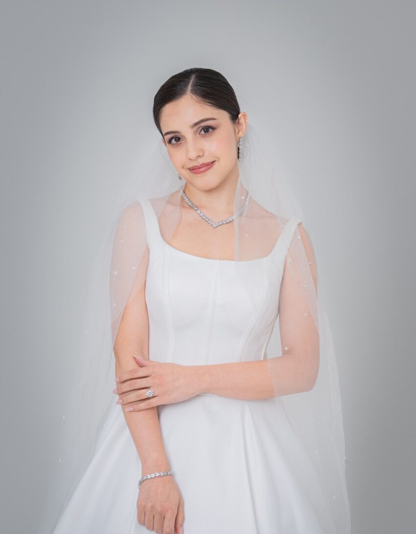 Featuring a soft, subtle shimmer, this waist length veil adds understated elegance. Its refined simplicity makes it versatile and easy to pair with any gown.