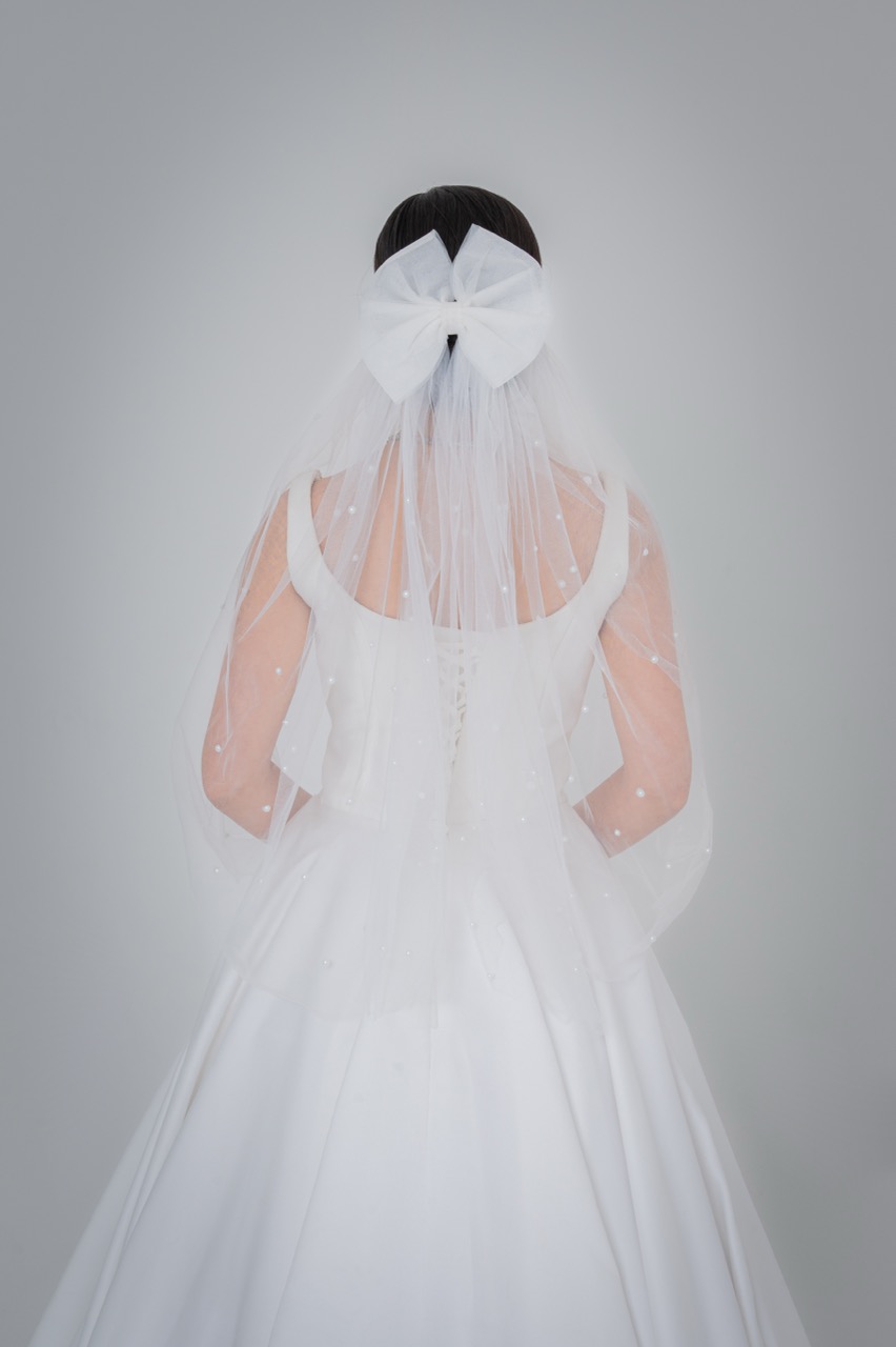 腰までの長さにパールを散りばめたデザイン。短めでも上品な存在感があり、可憐で洗練された印象を与えます。