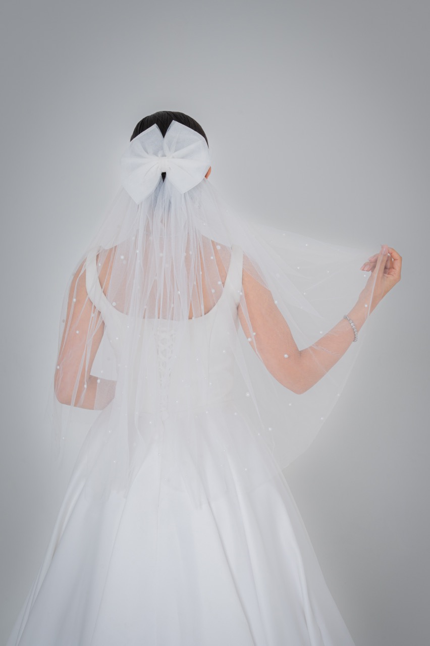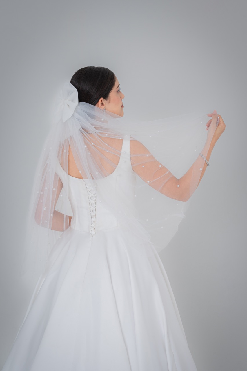 This waist length veil is delicately adorned with pearls, offering both sweetness and elegance. A chic option for brides who prefer a shorter, graceful style.