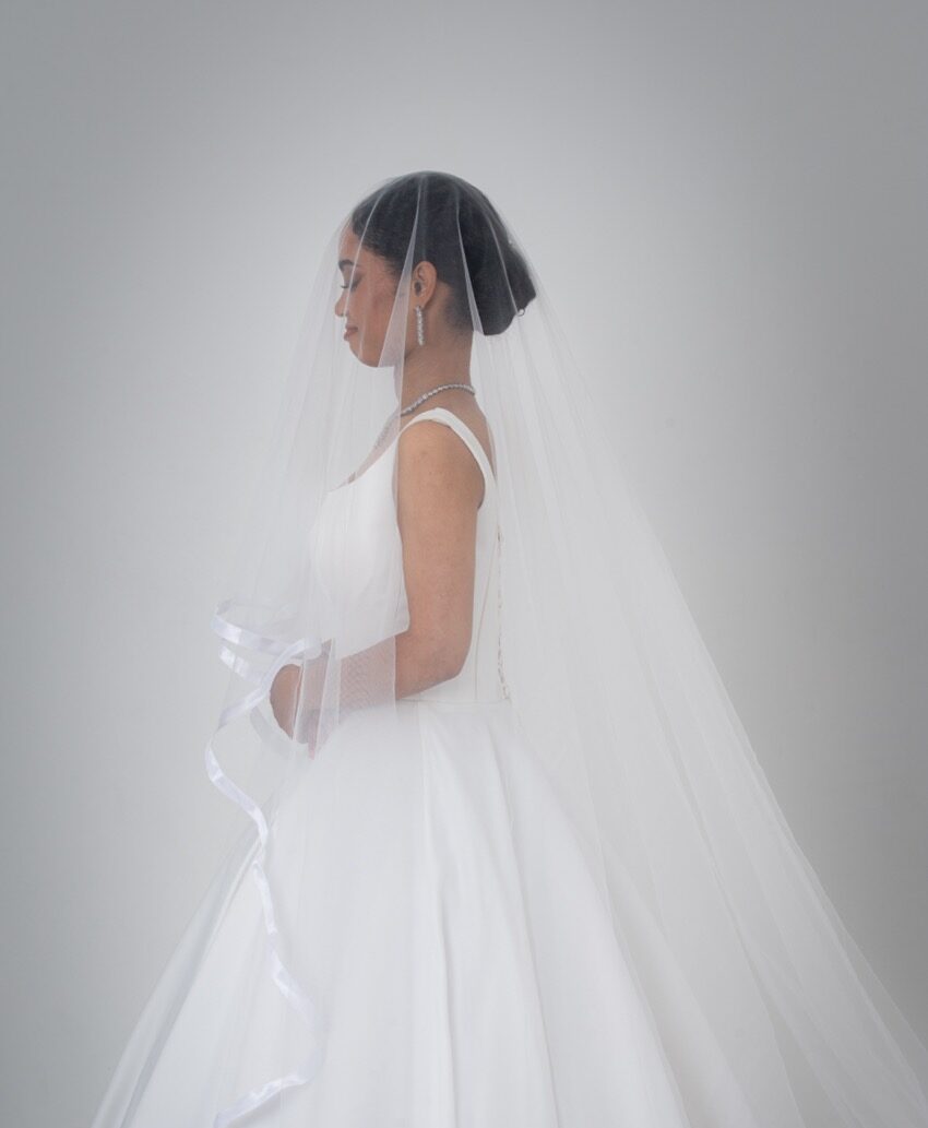 Elegant long veil with subtle white patterns along the edges. Simple yet graceful, ideal for brides who prefer a classic and refined bridal style. Can be worn draped over the face or gathered at the back, offering versatile styling options.