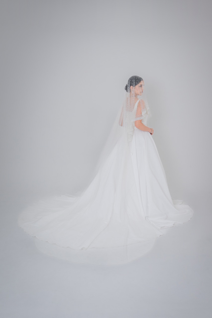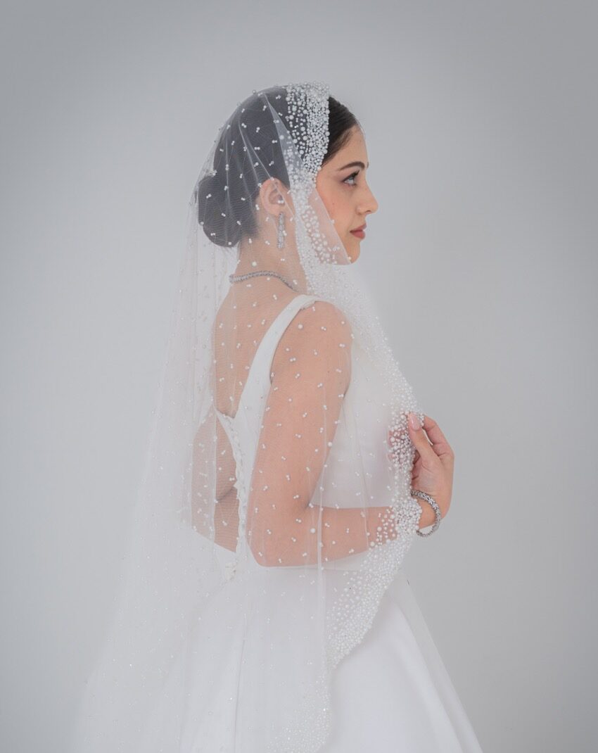 Long veil adorned with pearls throughout. Trendy and luxurious, this veil ensures you stand out as a unique bride.